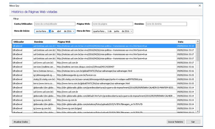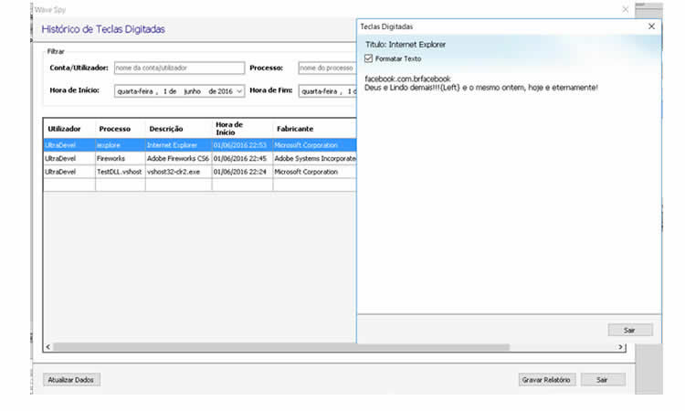 Detecta o abuso na Utilização daweb pelos colaboradores na empresa, monitorando e protegendo o ambiente corporativo. Monitora as telas dos computadores, com detalhes precisos, eficientes e exatos. Títulos de emails enviados, recebidos e tudo o que é digitado em documentos, planilhas e em cada aplicativo do computador. Com estas Informações o empresário poderá tomar medidas pró-ativas no que esta sendo copiado, teclado, visualizado, exibido e executado em cada máquina e com isso melhorar a produvidade da empresa como um todo. Recomendamos o uso do Wave Tracker Server para gerenciamento dos acessos na empresa